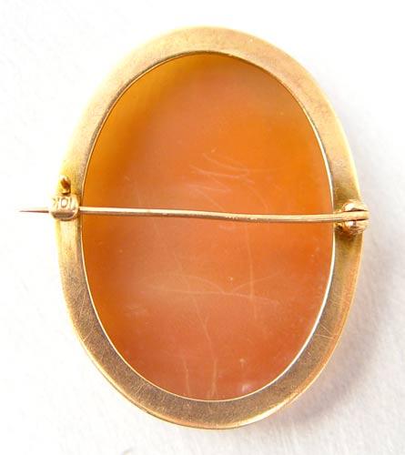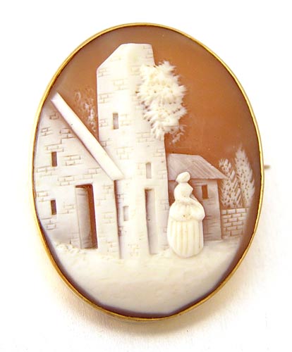 SHELL CARVED SCENIC VILLAGE CAMEO BROOCH FRAMED IN 10K GOLD: 1 5/8'' oval.