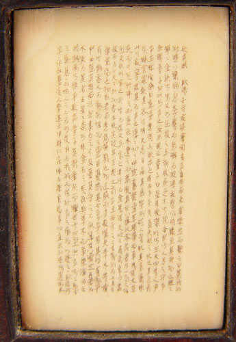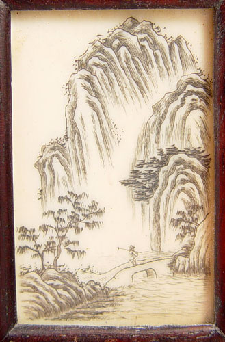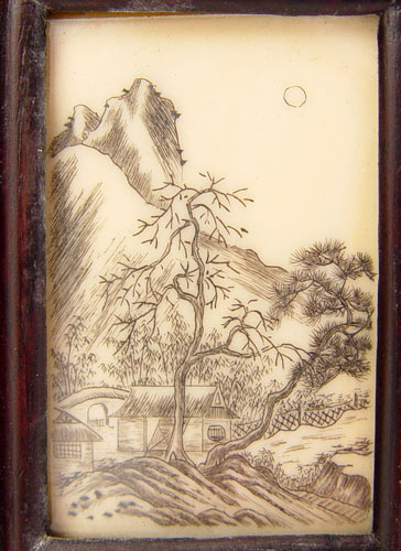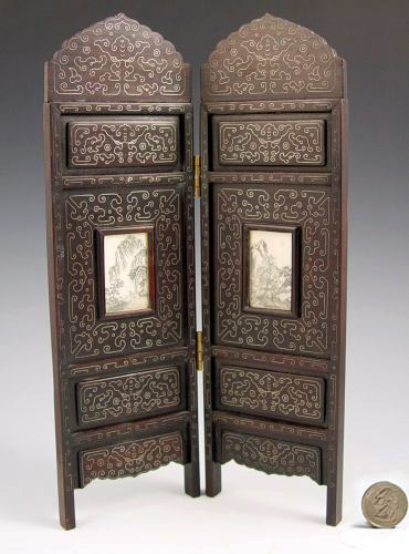 CHINESE INLAID ROSEWOOD 2 PANEL TABLE SCREEN: 2 panel screen of rosewood inlaid with silver wire and inset with ivory plaques engraved with landscapes and poems. 11 1/2''h. x 7 1/8''.