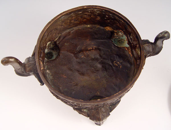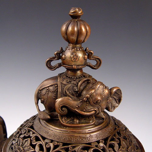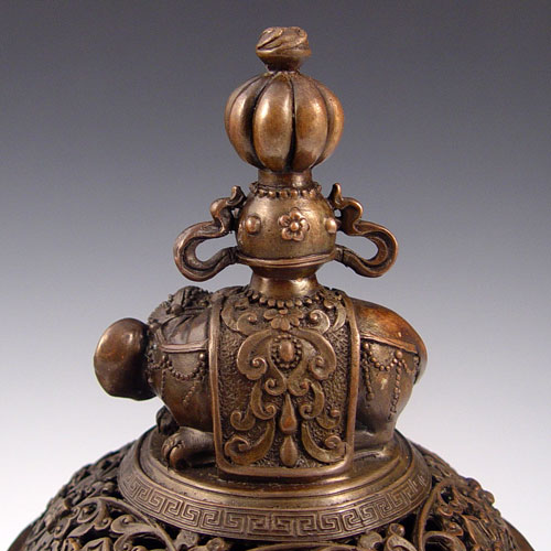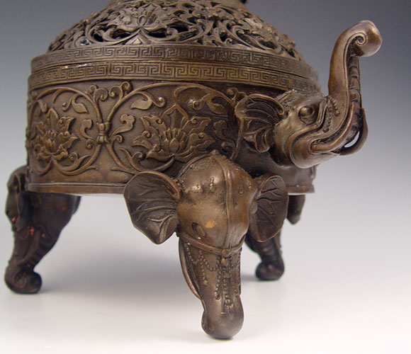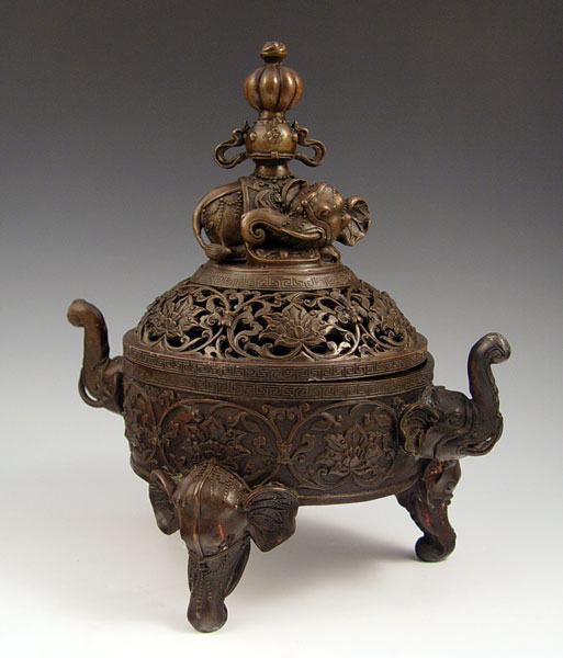 CHINESE ELEPHANT FIGURAL BRONZE CENSOR: Elephant figural top, handles and feet. Reticulated lid. Measures 11 1/4'' high x 9 3/4'' wide