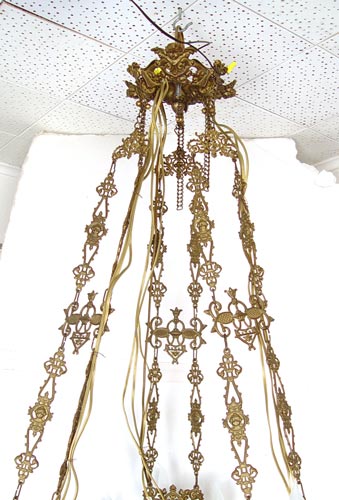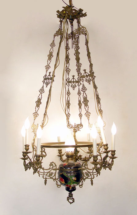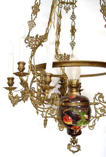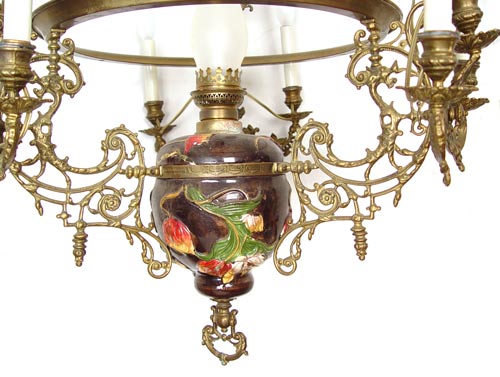 ELABORATE MAJOLICA AND GILT METAL CHANDELIER: Polychrome majolica font. 10 lights with one at the center. Ornate scrolled and gilt metal work. Hangs 56'', will accept a shade approx. 16'' dia. Electrified.