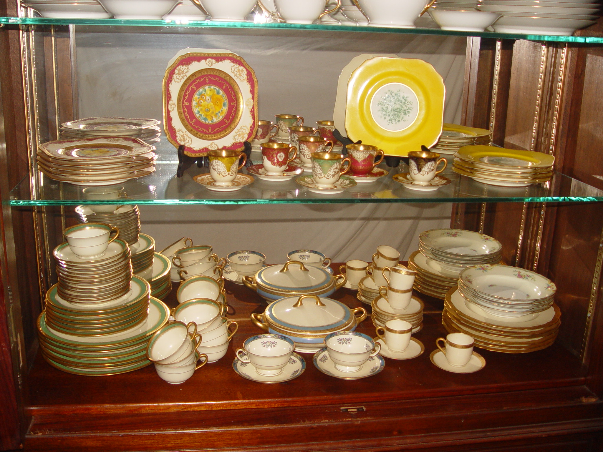LARGE COLLECTION OF BLACK KNIGHT CHINA: 56 pieces to include a set of 6 green rim dinner plates, 6 salad plates and 12 cups with saucers. Sold with 5 square rim yellow salad plates, 6 floral center salad plates, 6 ornate demi cups and saucers, 4 gold rim demi cups and saucers, blue rim covered vegetable, and four soup bowls.