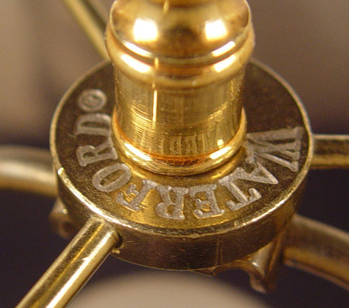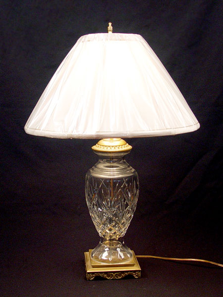 WATERFORD CRYSTAL TABLE LAMP: Bears the Waterford label, original shade with a cloth label. 29''h. overall, the shade is 19'' dia.