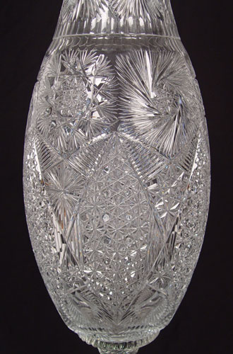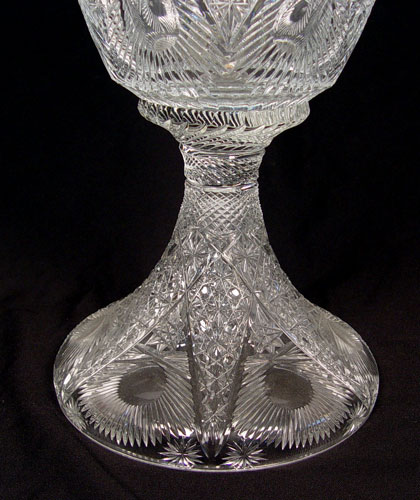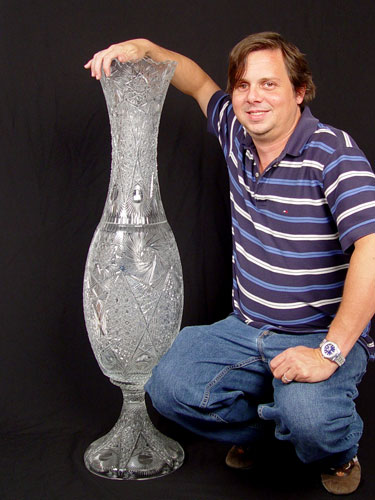 MONUMENTAL CUT GLASS FLOOR VASE: Contemporary cut glass vase on pedestal base. Measures 42 5/8'' high x 10'' wide at widest point.