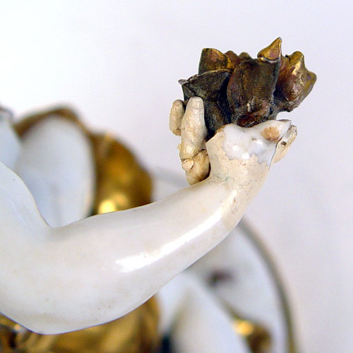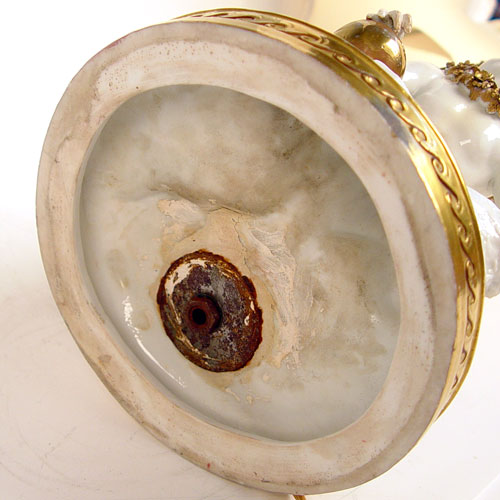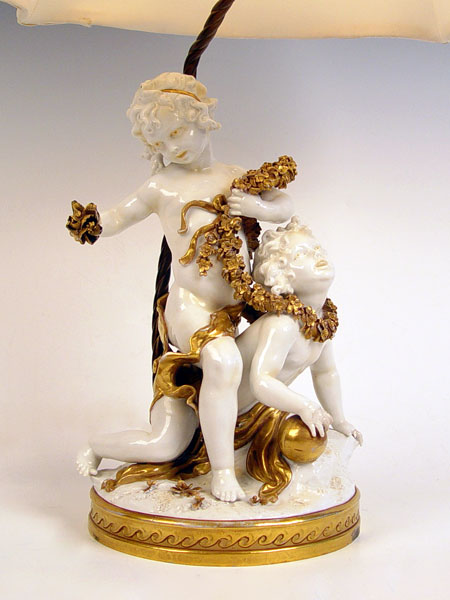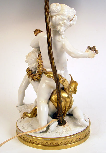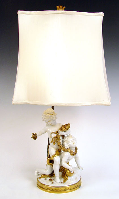 BLANC DE CHINE CAPO DI MONTE PORCELAIN FIGURAL LAMP: Two putti at play. Gilt porcelain flower chain and highlights. crown N mark. Lamp is 27'' h. Old restoration to a hand, finger loss on another. Some wear of the gold.
