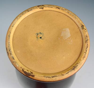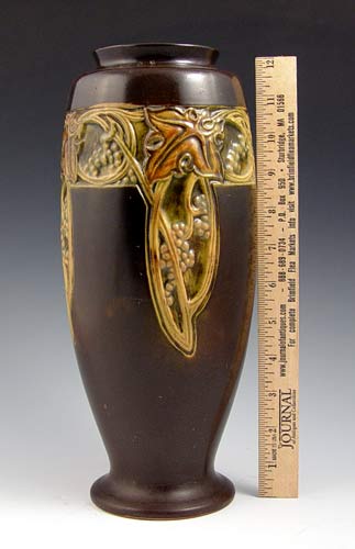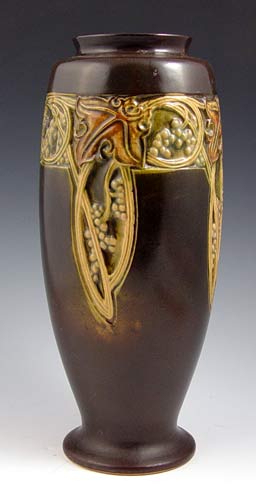 ROSEVILLE POTTERY VASE IN THE VINTAGE PATTERN: Note professional restoration on rim. Measures 12 1/2'' high x 5'' at widest point.