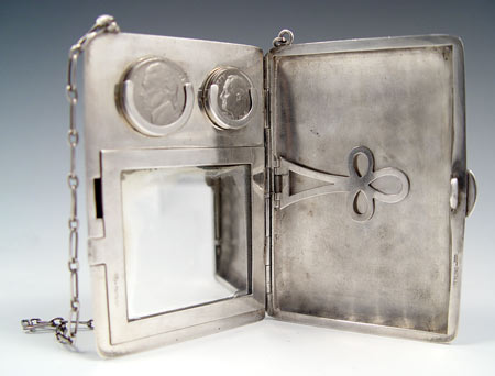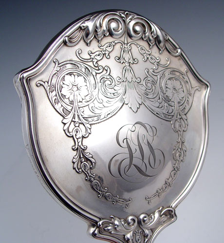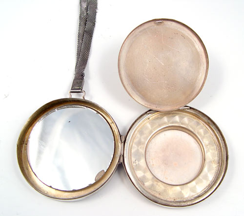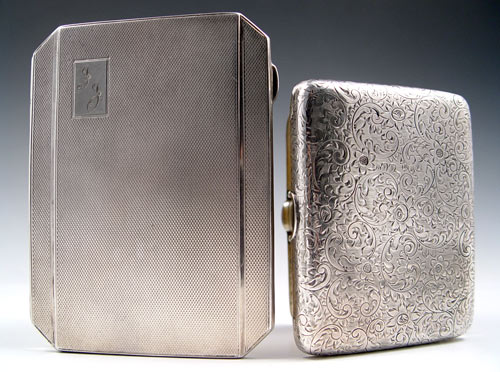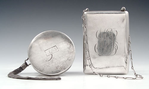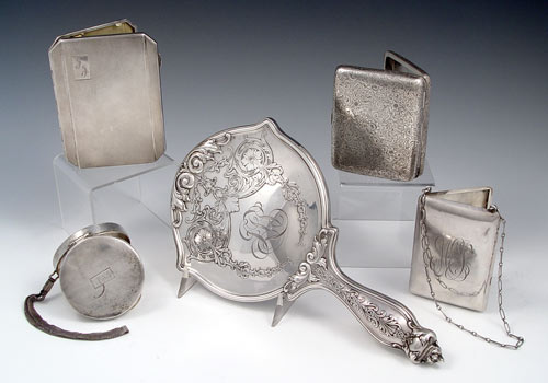 ESTATE STERLING CIGARETTE CASES, COMPACTS, MIRROR: 5 pieces to include 1) J. Gloster Ltd 1917 Birmingham cigarette case. Vermeil interior, note interior condition. Monogrammed. 2) Unmarked floral engraved cigarette case. 2) Webster compact / change holder with chain. Monogrammed. Note ding. 4) Unmarked round compact. Monogrammed. 5) Unknown America sterling handle hand mirror. Monogrammed. Measures 10 '' long, note dings.