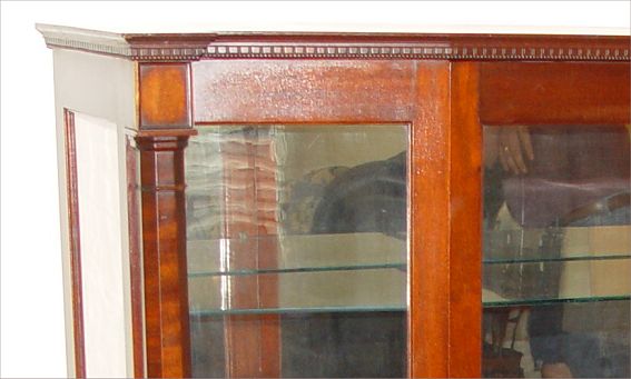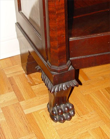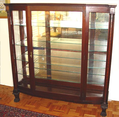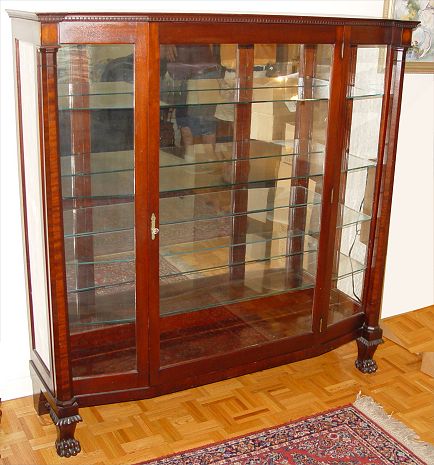 CARVED MAHOGANY BOOKCASE / DISPLAY CABINET: Late 19th - early 20th C. Slightly bowed glass front with center door. Finely detailed carved paw feet. Adjustable shelves are glass. 59 3/4'' h. x 58'' x 16'' deep, overall.