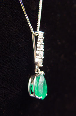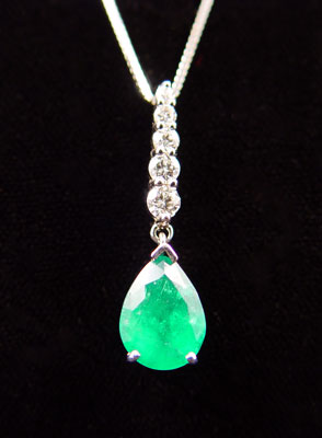 2.5 CT EMERALD PENDANT WITH DIAMONDS: 18K white gold mounting. The approx. 2.4 ct emerald is suspended from a graduating line of diamonds, approx. .3 ctw., average VS-SI in clarity and G-H in color. The diamonds and emerald are prong set. The emerald is rated VS2 in clarity, G hue, 5-6 tone and 4-5 saturation. 14K white gold box chain, 20'' l. Weight 3 grams. Sold with current Florida Diamond Appraisers GIA graduates appraisal for $4725. Est. $2000/3500**