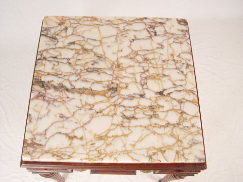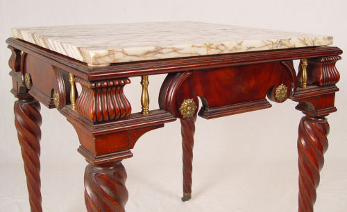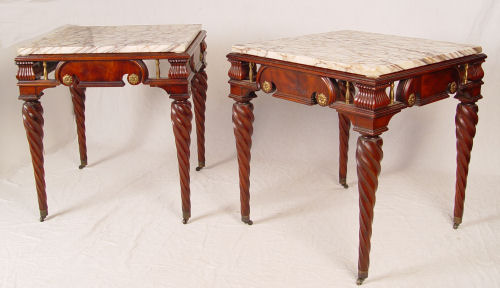 PAIR OF HAND CRAFTED MAHOGANY SPIRAL LEG TABLES: By a master furniture maker. Marble tops over an apron of flame grain mahogany, reeded corners, brass spirals and medallions. Tapered spiral legs ending in brass castors. 27''h. x 25'' square.