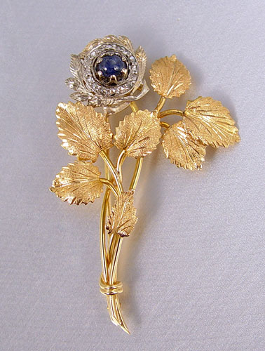 18K DIAMOND AND SAPPHIRE ROSE BROOCH: 18K yellow gold (marked 750) brooch contains 16 irregular shaped rose cut diamonds. Weight: .15 Ct. Approx. The diamonds average SI in clarity and I-J in color. The rose centers an approx. 1 ct oval shaped cabochon cut sapphire. The diamonds and sapphire are prong set. Bar pin closure. Weight: 9.6 grams. Approx. 2 1/4'' in length.