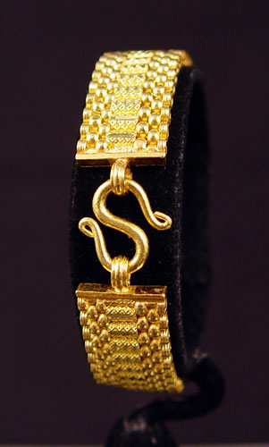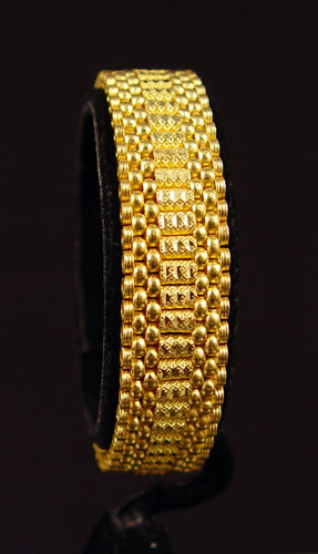 22 K FANCY GOLD LINK BRACELET: 22K yellow gold fancy link bracelet with ''S'' clasp. Approx. 1/2'' in width. Approx. 6 1/2'' in length. Weight: 45.7 grams.