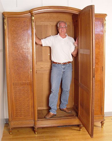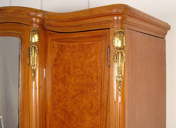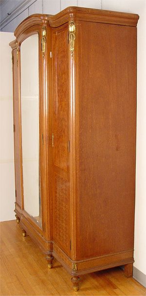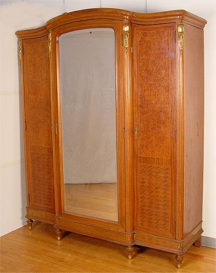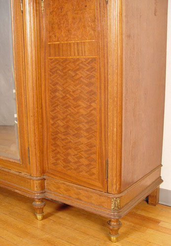 FRENCH LOUIS XVI STYLE MAHOGANY INLAID 3 DOOR ARMOIRE: Measures 88 1/4'''' high x 73'' wide x 25 1/2'' deep.