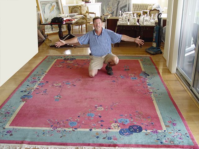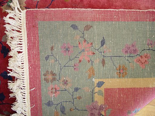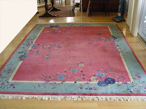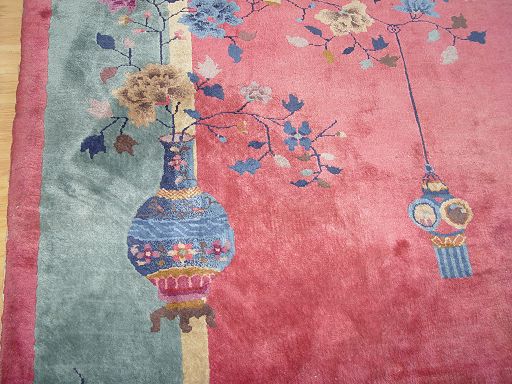 VINTAGE CHINESE ART DECO CARPET: Approx 11' 8'' x 9' x 2''. Teal border with unusual lantern pattern.