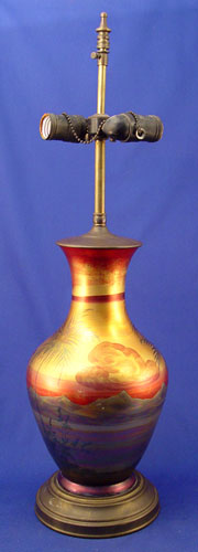 WELLER ''LASA'' ART POTTERY PALM TREE LAMP: Landscape with palm tree motif. Pottery is 12 1/2'' high, lamp is 24'' overall. Double sockets, pull chains. Unsigned, minor glaze loss.