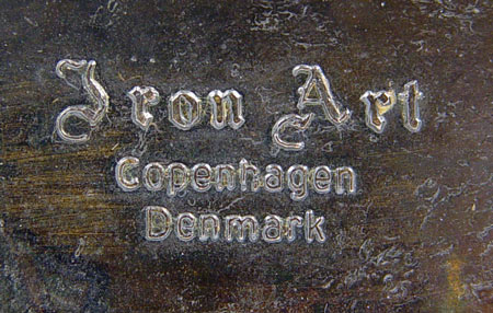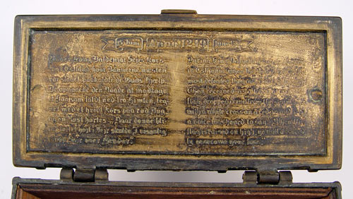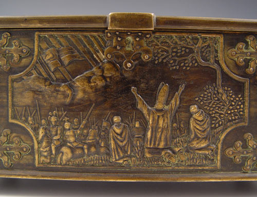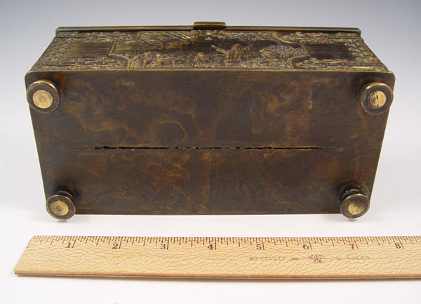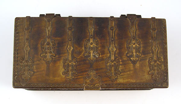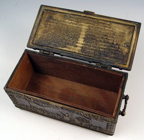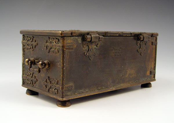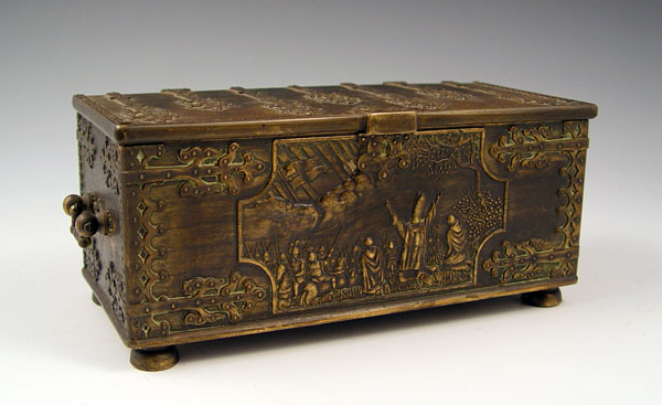IRON ART COPENHAGEN BRONZE CASKET BOX: Bronze casket box depicting Crusades scenes of Danish King Valdemar in 1219. Hinged lid, wood lined interior. Marked Iron Art Copenhagen Denmark. Measures 3 1/2'' high x 8 1/4'' x 4''.