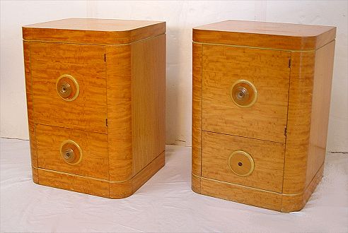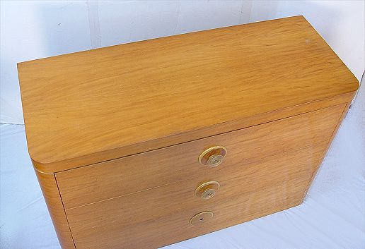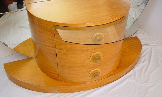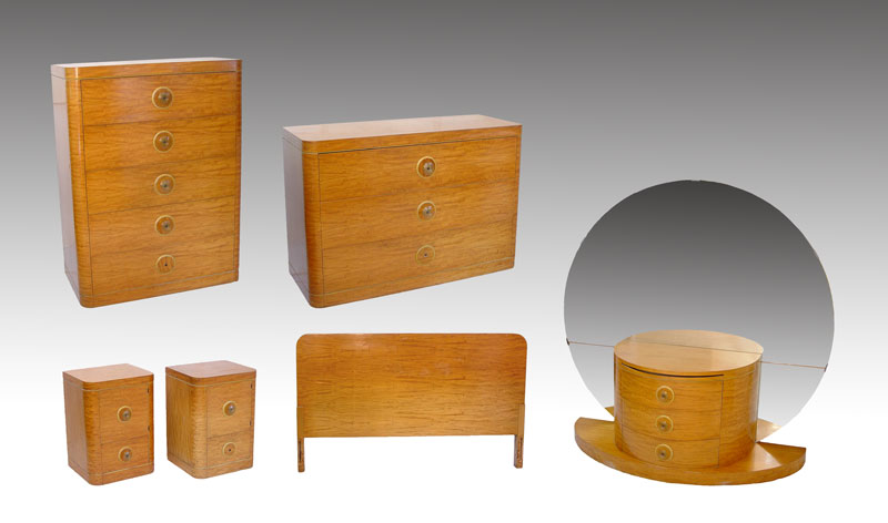 HIGH STYLE 7 PIECE ART DECO BEDROOM SET: To include Vanity with full round mirror measures 60'' high x 60 wide x 20 1/4'' deep, STOOL measures 17'' x 20'' dia, full size HEADBOARD 33'' high x 56'' wide, 5 drawer TALL CHEST measures 50 1/2'' high x 38'' wide x 21'' deep note chips, missing knob, 3 drawer DRESSER measures 34'' high x 50'' wide x 21'' deep, missing knob, rectangular wall MIRROR, and PAIR of NIGHTSTANDS measures 34'' high x 17'' wide x 16'' deep, missing knob. Must be sold to settle estate.