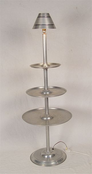 MODERN 3 TIER ALUMINUM FLOOR LAMP: Modern design with 3 levels of trays graduating size. Measures 58'' high x 20'' dia. largest tray. Note condition of aluminum.