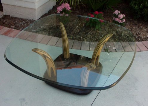 HENREDON MODERNE GLASS TOP COFFEE TABLE: Layered wood base and horn shaped supports. 16''h, the glass is approx. 43'' x 43''.