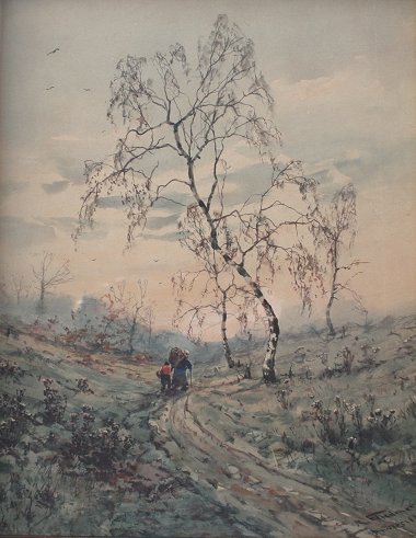 FEHDMER, Richard, (German, 1860-?): Figures Along a Trail, W/C, 20'' x 15'', signed lower right ''R Fehdmer, Anders 1889'', encased in embossed and gilded carved gesso frame, 29'' x 25''. Not examined out of the frame.