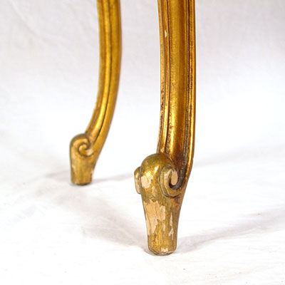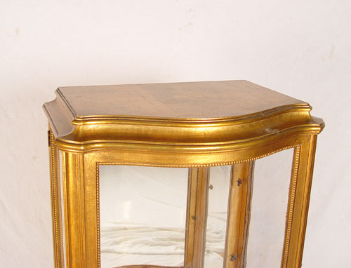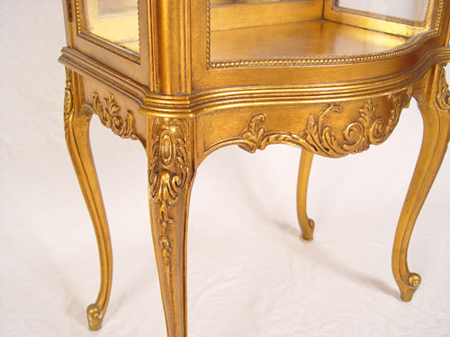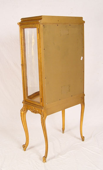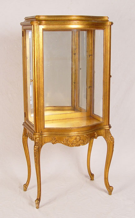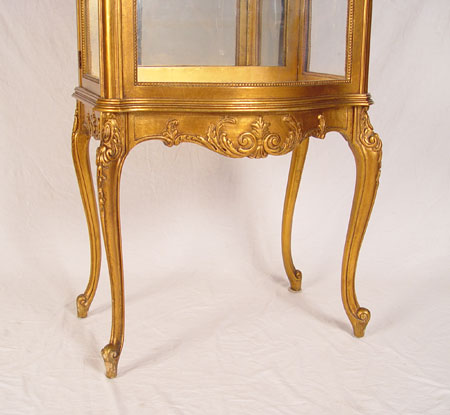 GILT FRENCH VITRINE DISPLAY CABINET: Bow front center glass, sides open as doors. Mirror back interior, you will need to add shelves. Graceful cabriole legs, scroll feet. Measures 52'' high x 23'' wide x 15 1/2'' deep.
