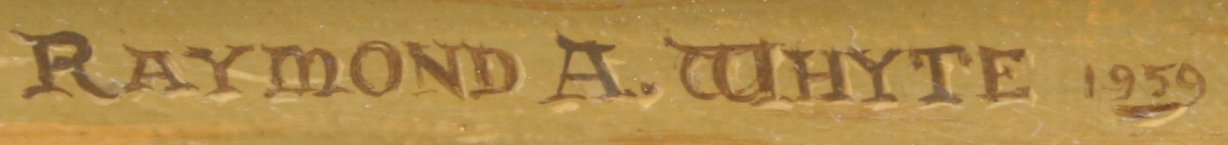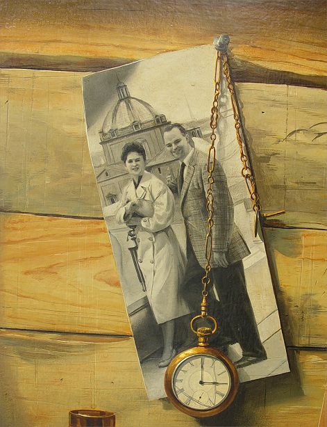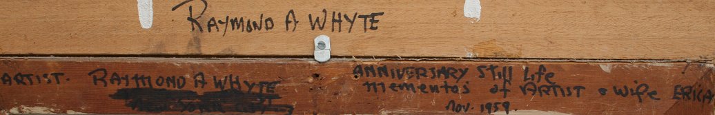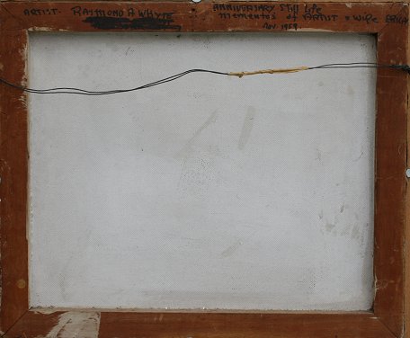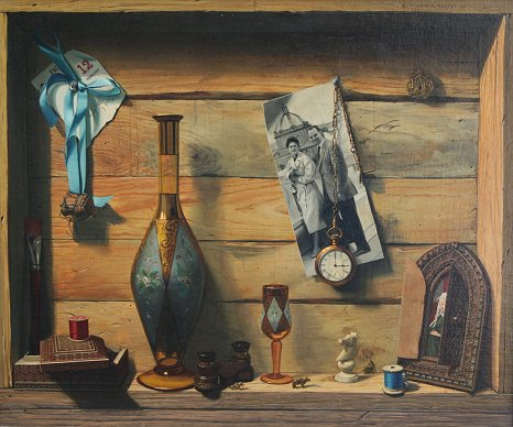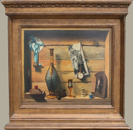 WHYTE, Raymond, (American, 1923-2002): Shadowbox Tromp L'oeil ''Anniversary Still Life, Mementos of Artist & Wife Erica'', OIL/C mounted on Masonite, 20'' x 24'', signed and dated Nov. 1959, titled verso, custom gilded gesso frame with minor wear, 31 1/2'' x 33'', 3 1/4''deep frame. Condition - Several very minor dents (sorry about that, the dents are part of the Tromp L'oeil!) There are several pinpoint flecks in the upper mid-margin though, and they really are pin head size. Est. $1000/2000**