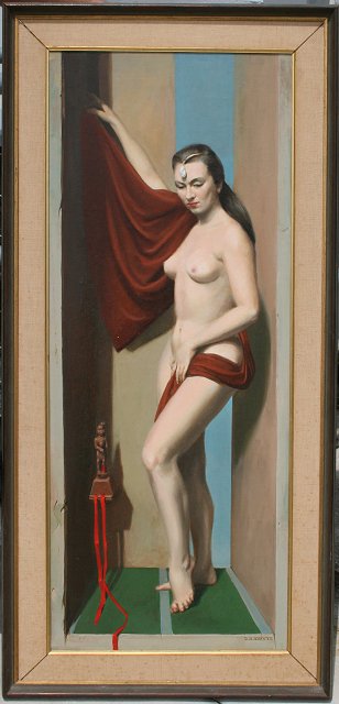 WHYTE, Raymond, (American, 1923-2002): Female Nude Posing with Carved Idol, OIL/CANVAS stretched on board, 44'' X 18'', signed lower right, wooden frame, 50'' X 22''. Est. $800/1200**