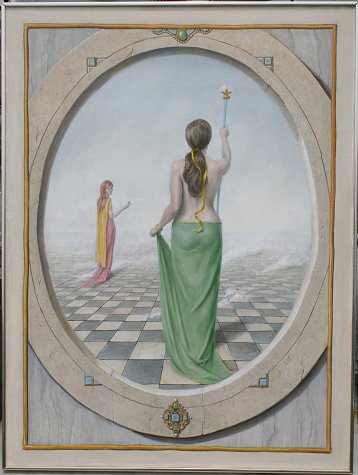WHYTE, Raymond, (American, 1923-2002): Fantasy Scene with two semi nude women in a vast checkerboard landscape viewed through a jeweled porthole, OIL/C, 40'' x 30'', signed lower right and on stretcher verso, thin edge frame, 41'' x 31''. Est. $600/800**