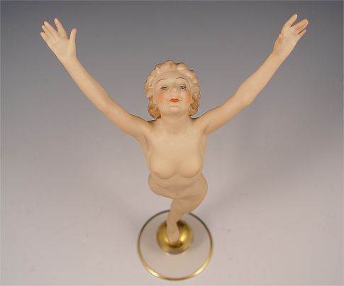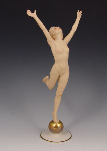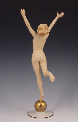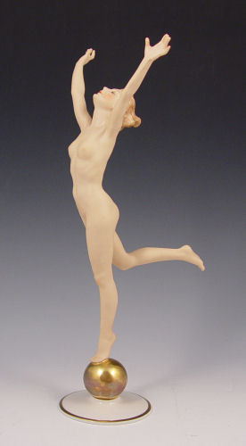 ART DECO HUTSCHENREUTHER NUDE FIGURE: ''Sunchild'', designed by Karl Tutter in 1938. Nude on a gold ball. 12 1/4'' tall.