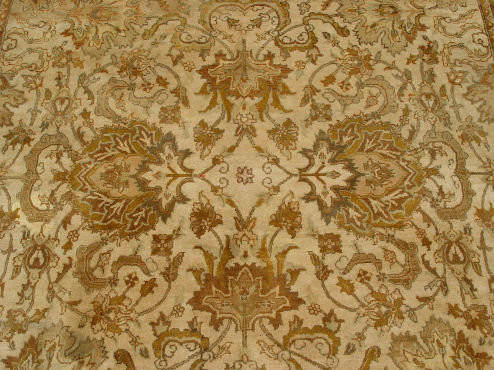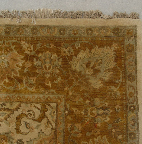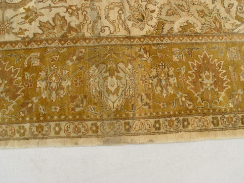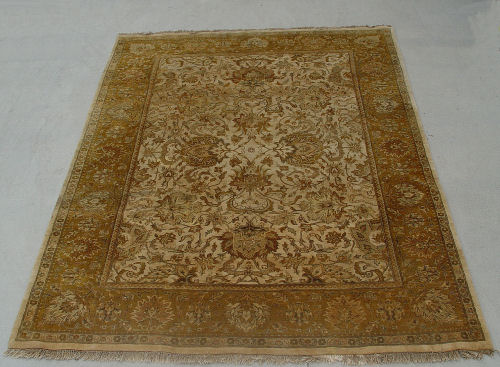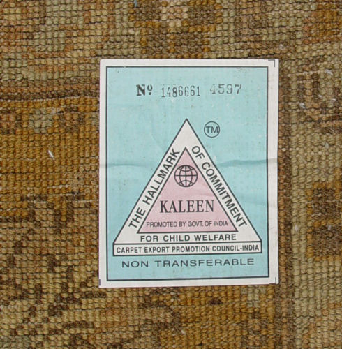 LARGE INDIAN CARPET: Approx. 12' x 8'10'', Beige ground with golden border, teal floral motif. Bears a tag ''The Hallmark of Commitment for Child Welfare Promoted by Govt. of India''.