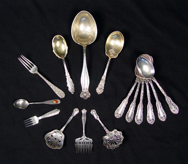 ESTATE COLLECTION OF STERLING FLATWARE: 15 pieces to include 1) 6 Dominck & Haff soup spoons (7''), monogrammed. 2) Towle tablespoon, monogrammed (8 3/4''). 3) Reed & Barton berry spoon, vermeil bowl, monogrammed (6 1/2''). 4) Whiting bon bon spoon, monogrammed (4 3/8''). 5) Gorham bon bon spoon (4 5/8''). 6) Towle small serving fork. Monogrammed (4 1/4''). 7) Steiff salad fork (6''). 8) Gorham sugar scoop (6''). 9) Wallace childs fork (3 5/8'') 10) Gorham souvenir Niagra Falls spoon (4 1/2''). Approx. 16.5 troy oz.