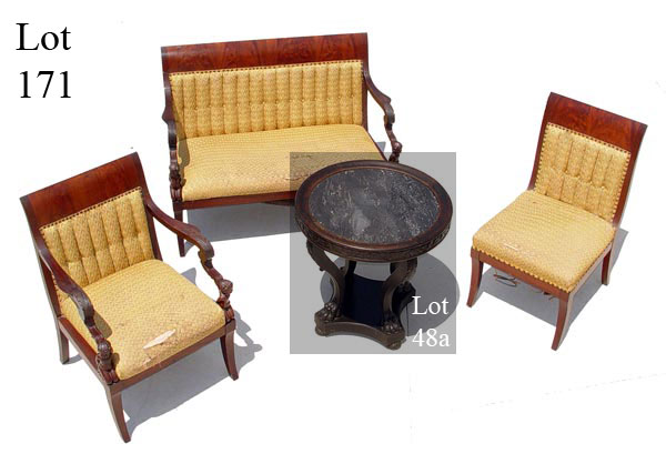 19TH C 3 PIECE CHERUB FIGURAL CARVED PARLOR SET: Richly grained mahogany frames Sette, arm chair and side chair. Ready for reupholstery. Arm supports in the form of winged cerubs. Note repair to on arm on each. Settee measures 25'' high x 44 1/4'' wide x 25'' deep. Armed side chair measures 35'' high x 24 1/2'' wide x 25'' deep.