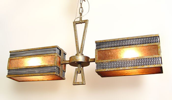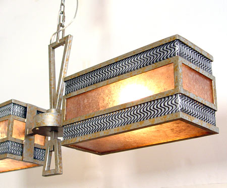 HIGH STYLE CONTEMPORARY CHANDELIER: Modern design, iron with mica panels. Fixture approx. 19''h. x 38''w. x 6''d., long chain for adjustable display.