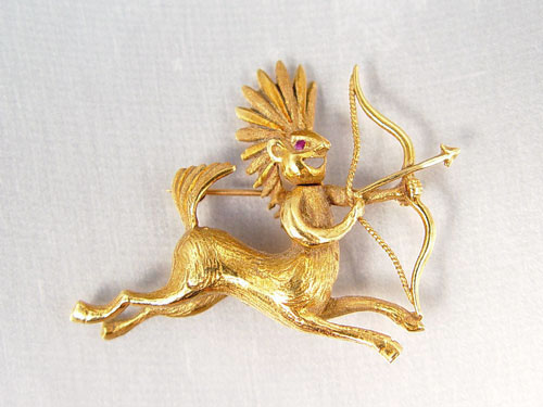 18K CENTAUR FIGURAL SIGNED BROOCH: 18K yellow gold brooch depicting a centaur with bow and arrow. The head wears a feather headdress and pivots. Approx. 2'' x 1 1/2'' Weight: 11.4 grams. Signed J.Rossit