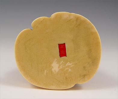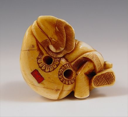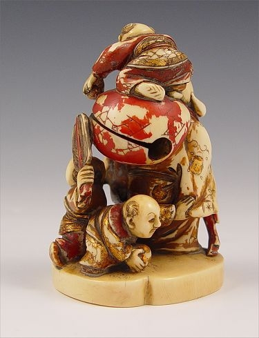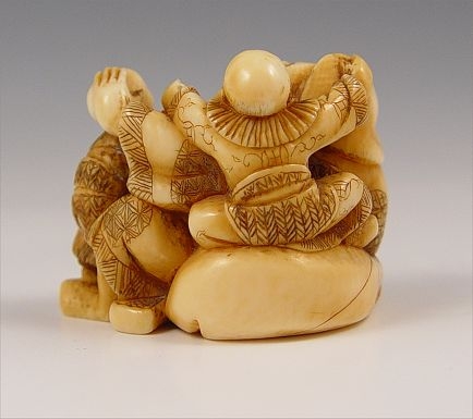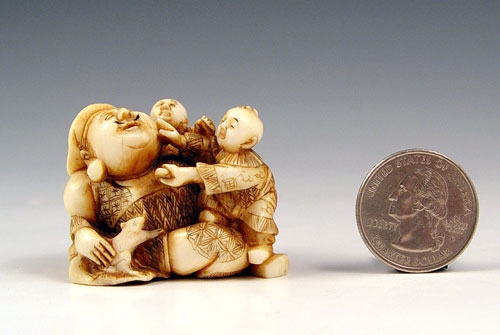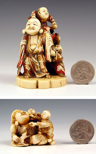 2 JAPANESE CARVED IVORY MULTI FIGURE NETSUKES 1) Painted man figure with backpack and 3 small children playing, note loss of paint. Signed in characters on base. Measures 3'' high x 2'' wide. 2) Seated man with 2 children and rat. Signed in characters on base. Measures 1 3/8'' high x 1 5/8'' wide.