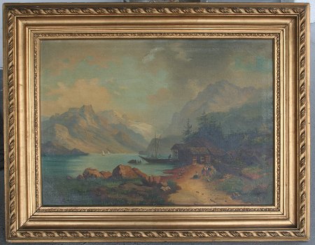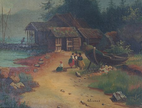 19TH C EUROPEAN FJORD SCENE WITH FIGURES: OIL/C, 18 3/4'' X 26'', signed A. Lucas, encased in gilded frame 26'' x 33''. Condition - Some paint flecks in upper margin and left margin, needs cleaning.