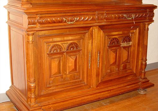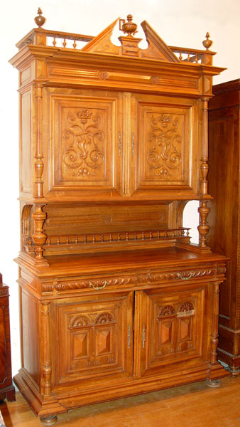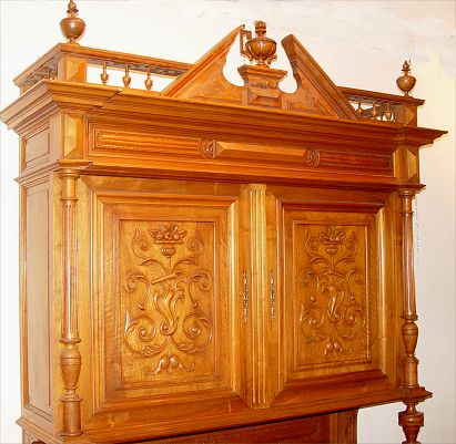 RENAISSANCE CARVED WALNUT SIDEBOARD: Galleried crest centers pediment with urn (loss of urn handle). Carved door panels, exterior plate rail, turned columns. Measures approx 106'' high x 58'' wide x 24 1/2'' deep.
