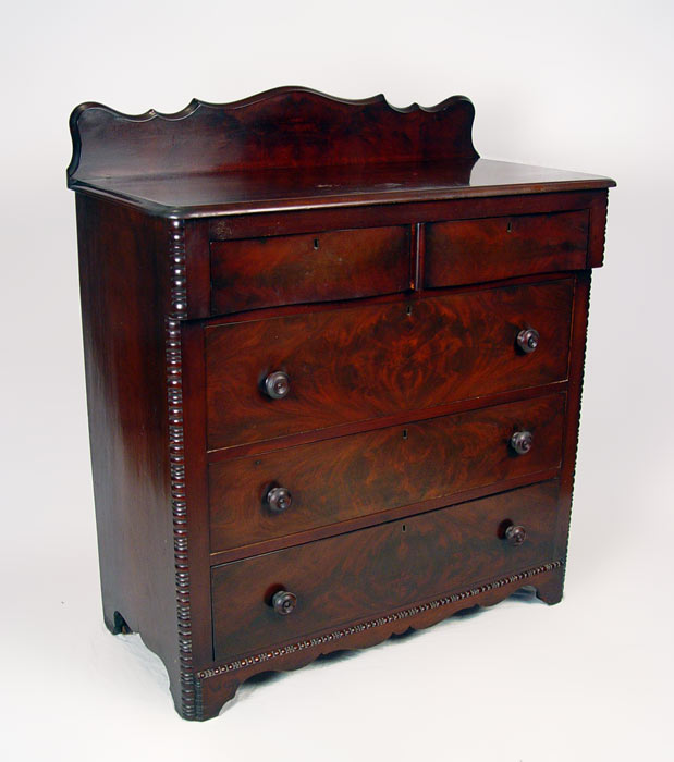 VICTORIAN COTTAGE MAHOGANY CHEST OF DRAWERS: 2 half drawers over 3 full length drawers. Measures 46'' high x 40 1/2'' wide x 19 1/2'' deep. Note scratches to finish.