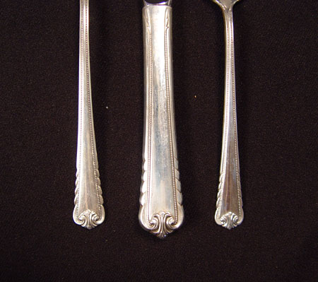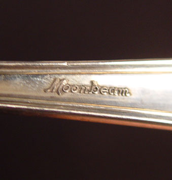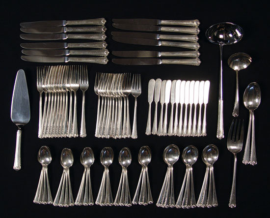 ROGER BROTHERS MOONBEAM STERLING FLATWARE SERVICE: Complete service for 12, 90 pieces in the ''Moonbeam'' pattern by Rogers Brothers to include 12 dinner forks (7 1/4''), 12 salad forks (6 3/8''), 24 teaspoons (6''), 12 round bowl soup spoons (6 1/2''), 12 dinner knives (9 1/8''), 12 solid butter knives (5 5/8''), 2 tablespoons (8 3/8''), serving fork (9 1/8''), solid gravy ladle (6 1/2''), stainless bowl soup ladle (12''). Approx 93.8 troy oz. Comes in dark wood silver chest, measures 3 5/8'' high x 17'' x 11 1/2''. Est. $1500/2000**