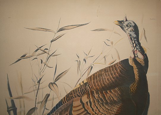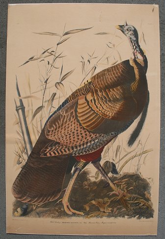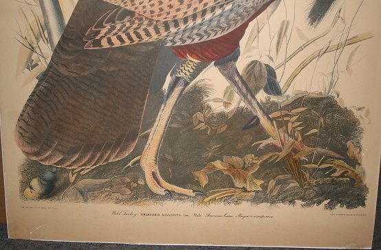 AUDUBON, John James, after, (1785-1851): Wild Turkey, 37 3/4'' x 25'', Lithograph, marked Havell edition, probably a 20th c. copy, thin frame, 42'' x 29''. Condition - Laid down on acid free board, several abrasions most notably in the lower left corner, scraps with small bits of missing paper, some moisture damage lower right corner, some surface dirt upper right margin, lifting from board in mid left margin extending in 7''. Sold as is. Est. $500/800**