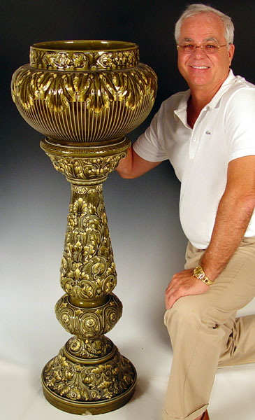 LARGE GREEN MAJOLICA PEDESTAL & JARDINIERE: Similar design but not matched. Jardiniere measures 11 1/4'' high x 17'' dia. Note crack repair running entire length. Pedestal measures 36 1/2'' high x 17'' base dia.