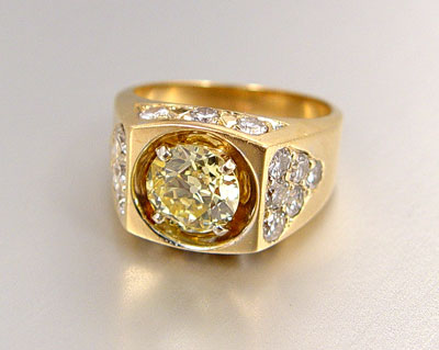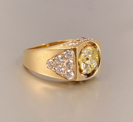 3.22 CTW FANCY LIGHT YELLOW DIAMOND RING: 14k yellow gold man's ring featuring a 1.96 ct old Euro cut Fancy Light Yellow diamond, VS-1 clarity, prong set. Shoulders have triangular pattern containing 12 bead set round full cut diamonds with 12 bead set round full cut diamonds set to the sides. The 18 accent diamonds average .07ct each, H-I color and VS2 to I1 clarity. Sold with a current Schuler Gemological Services, Inc GIA graduates appraisal, $10,685.00 replacement value. Est. $5000/7500**