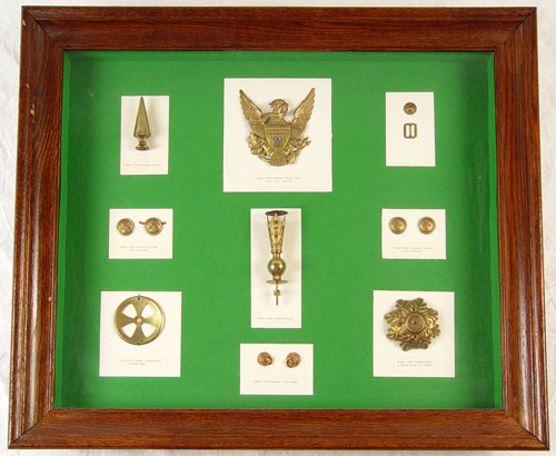 FRAMED COLLECTION OF INDIAN WARS HELMET HARDWARE: To include 1) 1881 Eagle plate 2nd US Cavalry 2) 1881 Helmet spike. 3) 1881 Plume holder. 4) 1881 Plume and spike base. 5) 1881 Helmet cord rings. 6) Spike and plum under helmet holder marked Hortsmann. 7) 1881 Cavalry side buttons. 8) 1881 Infantry side buttons. 9) Strap buckle. Not inspected out of frame. Shadowbox frame measures 24'' x 27 3/4'' x 3 3/8'' deep.