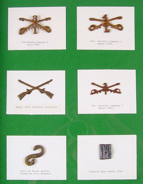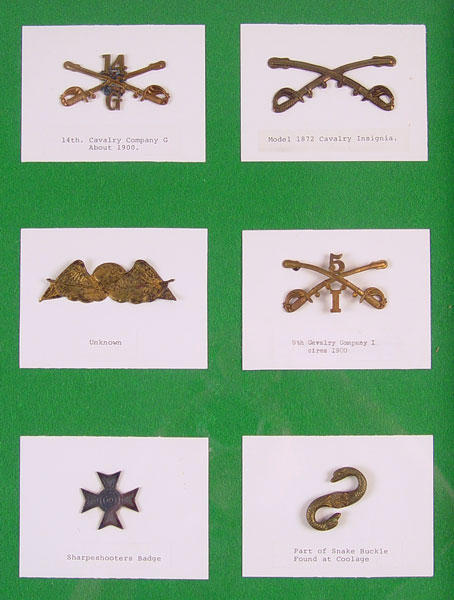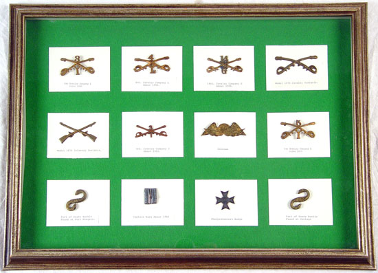 FRAMED COLLECTION OF MILITARY HAT INSIGNIAS: To include 1) Circa 1900 3rd cavalry company I. 2) Circa 1900 4th cavalry company L. 3) Circa 1900 14 cavalry company G. 4) Model 1872 cavalry. 5) Model 1874 infantry. 6) 1902 3rd cavalry company I. 7) Eagle with spread wings. 8) Circa 1900 5th cavalry company I. 9) 2 found parts of snake buckle one found Fort Wingate, other at Collage. 10) 1902 Captains bars. 11) Sharpshooters badge. Not examined out of shadow box frame. Shadowbox frame measures 17 3/4'' x 23 3/4'' x 1 3/4'' deep.