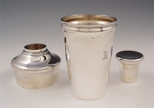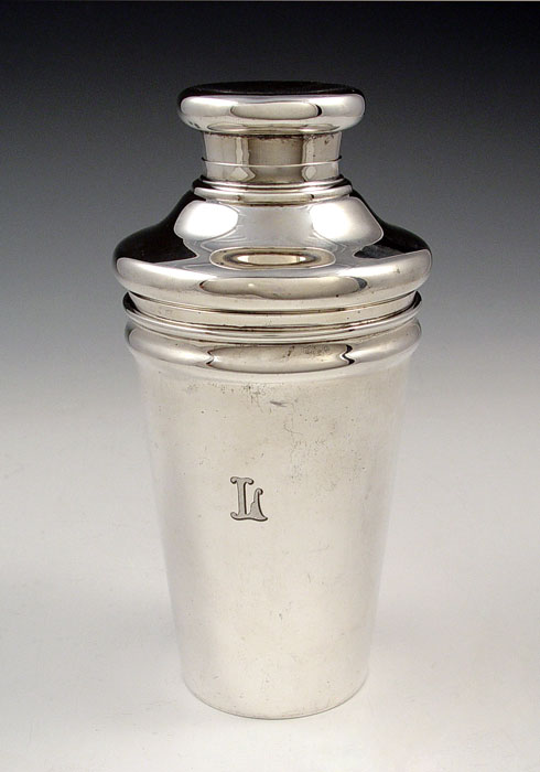 TIFFANY & CO. STERLING COCKTAIL SHAKER: 3 Gills, monogrammed L. Measures 7'' high. Approx 13.1 troy oz.