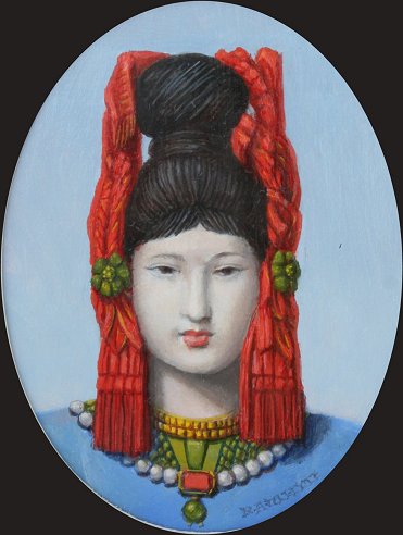WHYTE, Raymond, (American, 1923-2002): Cameo, Portrait of a Japanese Girl in Red Headdress, OIL/B, oval 3 3/4'' x 3'', signed lower right, framed 8 1/4'' x 6 1/4'', exhibition label verso. Est. $300/500**