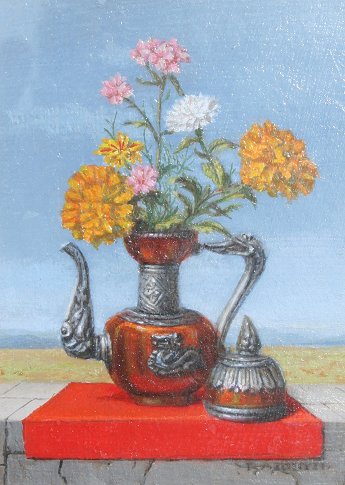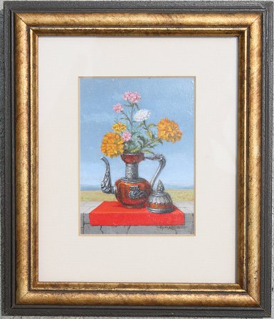 WHYTE, Raymond, (American, 1923-2002): Still Life of Mums in a Persian Metal Teapot set in a vast landscape, OIL/B, 3 3/4'' x 2 1/2'', signed lower right, framed 7 1/4'' x 6 1/4''. Est. $300/500**