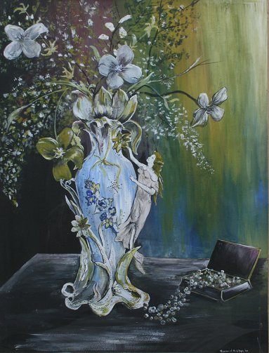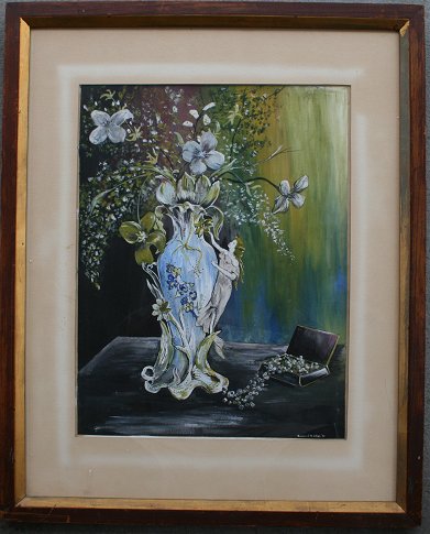 WHYTE, Raymond, (American, 1923-2002): Still life of floral arrangement in porcelain vase with figural female and overflowing jewel box, Gouache, 18'' x 14'', signed and dated 1940, a very early Raymond Whyte work, wood and gilt frame with wear, 27'' x 22''. Est. $300/500**