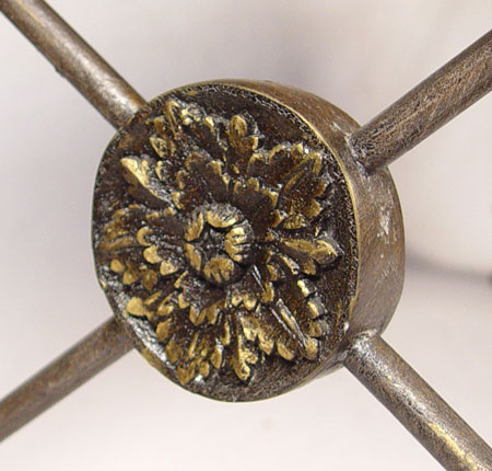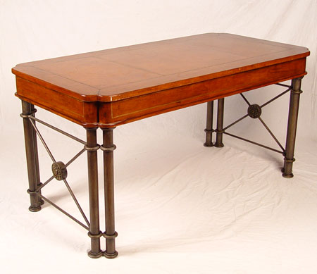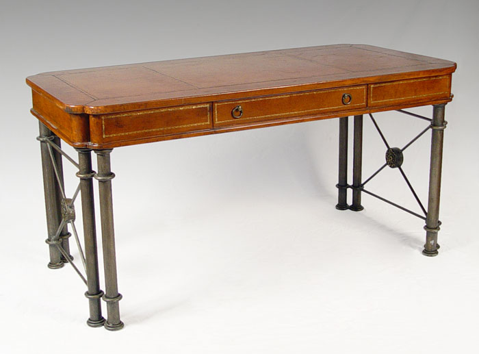 CONTEMPORARY LEATHER TOP DESK: Decorative metal legs and braces with floral medallion. Single drawer. 30 1/2'' high x 60 1/2'' x 30 1/2''.