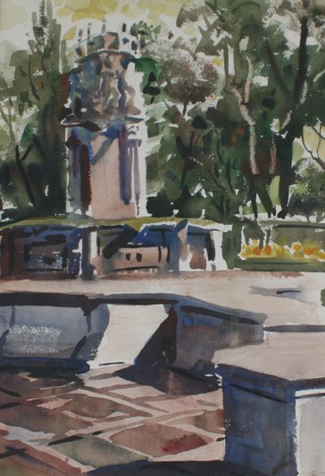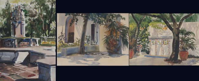 THOBURN, Jean, (American, 1887-1934): 3 California W/C lot. 1)''Claremont Campus'', sight size 14 1/2'' x 21 3/4'', no visible signature, titled verso, painted frame 23'' x 29'', slight mat burn. 2)''California Sunshine'', sight size 14 1/2'' x 21 1/2'', titled verso, encased in painted frame with wear, 24'' x 29''. 3)''Fountain at Mellon Park'', sight size 21 1/2'' x 14 1/2'', signed, wood frame with wear, 31'' x 24 1/2''.
