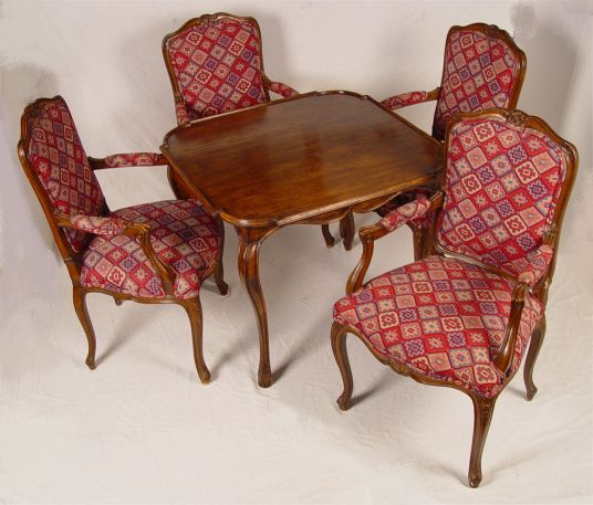 FRENCH GAME TABLE AND CHAIRS: Table measures 29'' high x 32 1/2'' square. Chairs measure 40 1/2'' high x 24'' wide x 24'' deep.